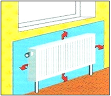 Радиаторы системы отопления располагаются чаще всего под окнами на расстоянии примерно 20 см от внешней стены. Таким образом часть теплового потока от радиаторов расходуется на прогрев стены.