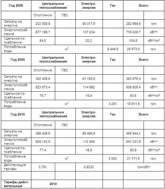 Таблица 1 показывает измеренное энергопотребление и затраты на здание за три последних года, до внедрения энергоэффективных мероприятий.