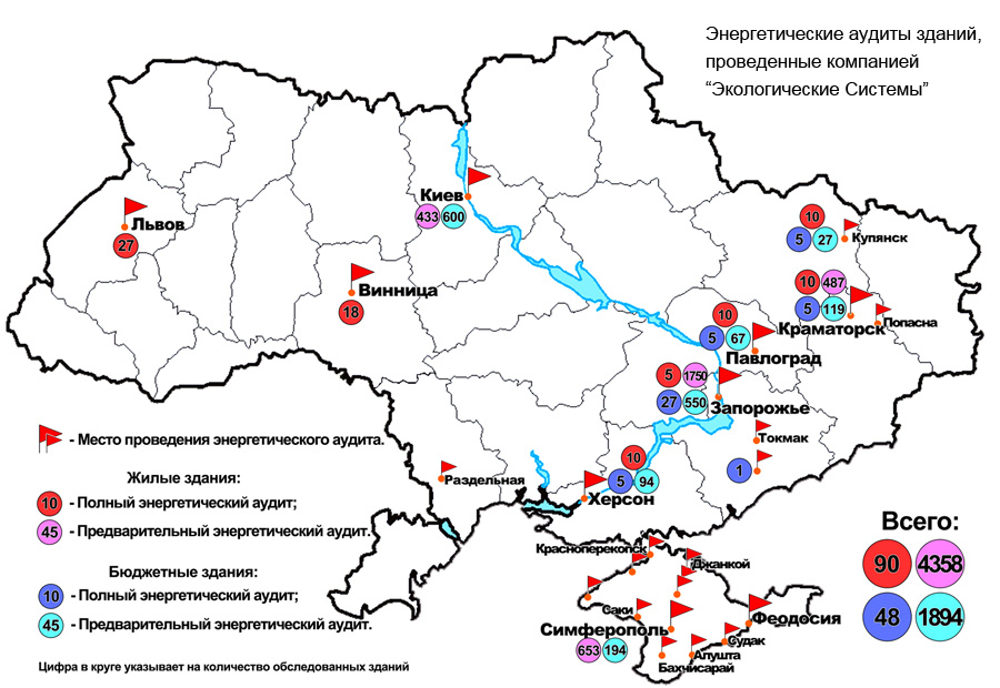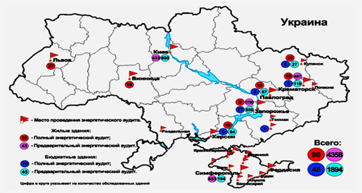 Многочисленные энергетические аудиты жилых и бюджетных зданий, проведенные нашей компанией в разных регионах Украины (см. карту), показали, что удельное теплопотребление существующих зданий находится в интервале 180-240 кВт.час на м.кв в год. Окупаемость проектов глубокой термомодернизации в Украине до уровня 35-45 кВт.час на м.кв в год для зданий бюджетной сферы составляет 8-11 лет, для жилых зданий - 35-45 лет.