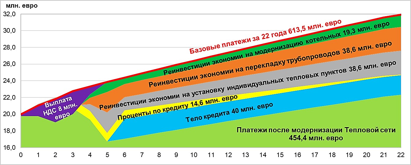 Ниже показан пример расчёта требуемых реинвестиций на глубокую модернизацию системы ЦТ крупного города с населением 600 000 человек. Приведен пример реального инвестиционного проекта модернизации части системы ЦТ (примерно 35% от всей системы) с полным обновлением основных фондов на основе современного оборудования и технологий. Инвестируя примерно 40 миллионов евро в глубокую модернизацию части системы ЦТ, мы получаем в виде снижения эксплуатационных затрат (включая топливо) не только средства на возврат инвестиций, но и средства на глубокую модернизацию оставшейся части системы ЦТ, примерно 96 миллионов евро. План действий рассчитан на 22 года и требует ежемесячной фиксации получаемой экономии денежных средств и их целевого использования на этом временном интервале. Стартовый кредит, а дальше финансирование развития из экономии. Кредиты уже не нужны.